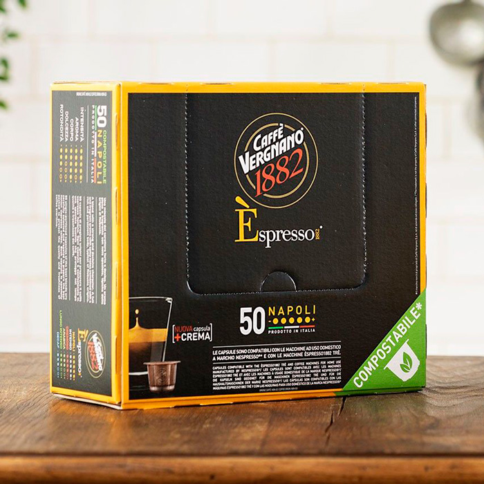 Nuestras cápsulas compatibles con Nespresso ® * y Èspresso1882 TRÈ mezcla È Napoli son compostables. Producidas con material biodegradable, después de su uso, se pueden eliminar fácilmente en la recolección de residuos húmedos. Prácticas y rápidas de usar, basta con introducirlas dentro de la máquina de café para obtener, en pocos segundos, un sabroso espresso con una crema espesa y con cuerpo como el de la cafetería.