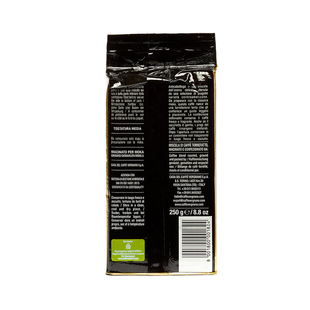 El Antica Bottega Gold Blend es un café arábica de delicado aroma, obtenido de una selección de finas variedades centroamericanas. Molido para ser preparado con la máquina Moka o para preparaciones de café filtrado, el tueste lento resalta un sabor ligero y agradable.El envase al vacío mantiene el café fresco y fragante.